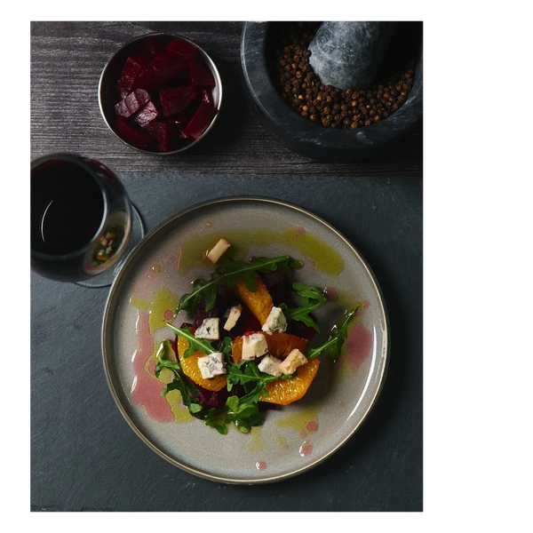 Salty and sweet medley, arugula with orange slices, roasted beets, gorgonzola cubes, tied all together with red wine vinegar and olive oil.
